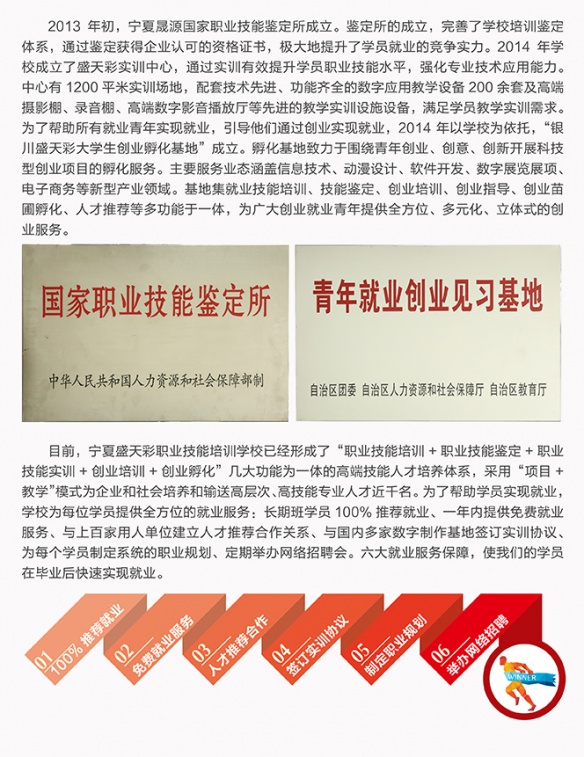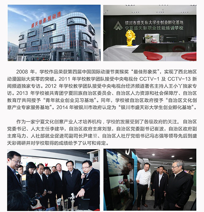 寧夏盛天彩職業(yè)技能培訓(xùn)學(xué)校是經(jīng)自治區(qū)人力資源與社會保障廳審核批準的寧夏地區(qū)成立最早、教學(xué)規(guī)模最大設(shè)置課程最全面、專業(yè)性最強的數(shù)字藝術(shù)培訓(xùn)機構(gòu),是銀川市政府重點扶持的動畫教育實訓(xùn)基地,寧夏文化創(chuàng)意產(chǎn)業(yè)基地指定人才培養(yǎng)中心,也是西北地區(qū)唯一接受中央電視臺專訪的高技能人才培育機構(gòu)。